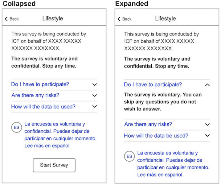 Respondents may have questions about consent elements. Rather than putting helpful information in an FAQ that requires a link, revise the screen design to include expanding areas with additional information, as shown below: