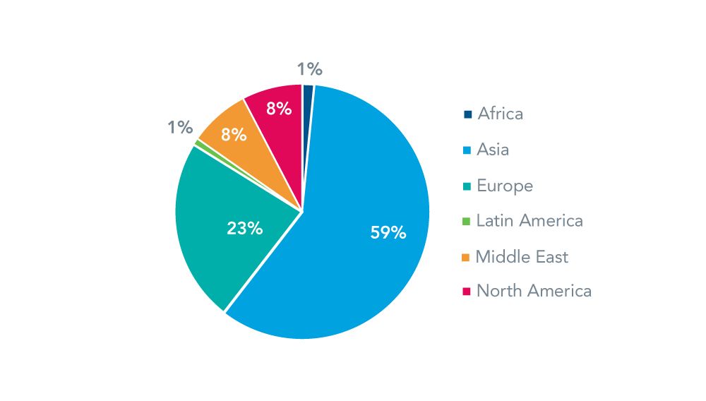 The A330ceo fleet is reasonably well-dispersed geographically but dominated by operators in the Asia Pacific (APAC) region, where 47% of the aircraft operate. Nearly 30% of the fleet is in service in Europe, making it the second-highest geographic regional concentration, while 12% of the fleet resides in the Africa and Middle East regions.